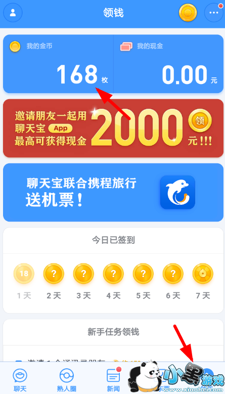 1、打开聊天宝软件之后,需要先选择右下角的“领钱”按钮,然后选择其中的“金币”功能。