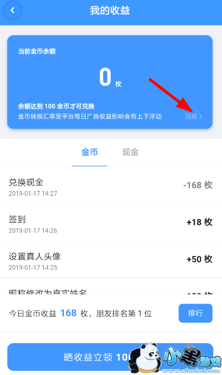 2、打开金币页面之后,大家还得通过右下角的“兑换”按钮将金币兑换为人民币收益,之后才可以进行提现。