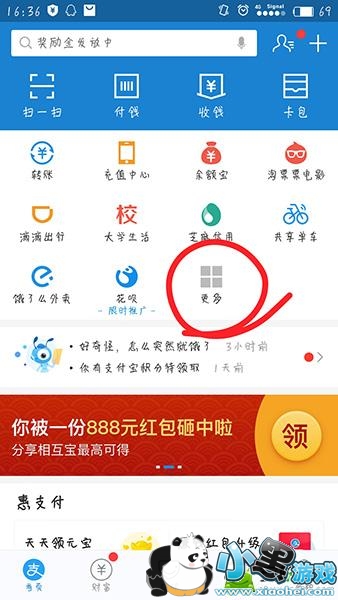 1、点击打开支付宝APP,在支付宝的首页中点击【更多】选项打开所有应用界面。