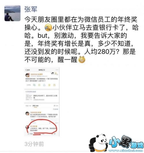 有传闻称,微信年终奖人均280万元,此消息在微博迅速传播。刚刚,腾讯公关总监张军表示,还没到发的时候,人均280万是不可能的。