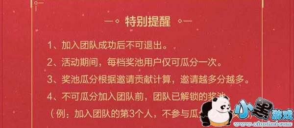 4、不可瓜分加入团队前,团队已解锁的奖池。(例如:加入团队的第3个人,不参与瓜分2人档奖池)