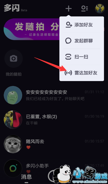 1、打开多闪的首页之后,用户需要从右上角点击“+”按钮,然后在唤起的列表当中选择“雷达加好友”功能,从而扫描附近的多闪用户。