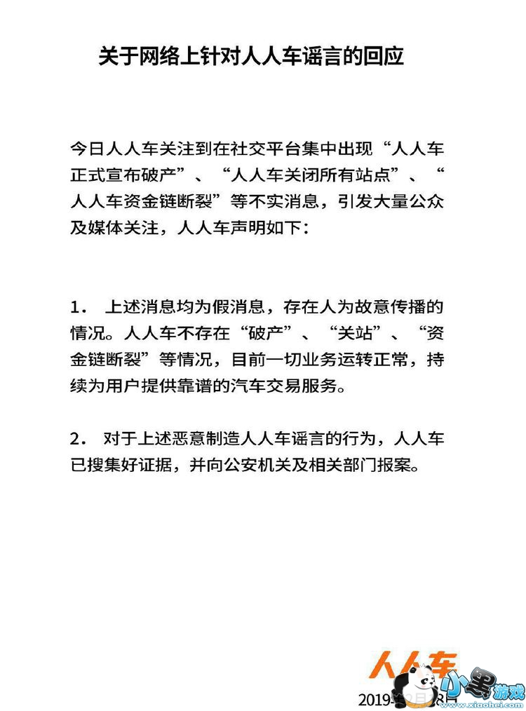 1.上述消息均为假消息,存在人为故意传播的情况。人人车不存在“破产”、“关站”、“资金链断裂”等情况,目前一切业务运转正常,持续为用户提供靠谱的汽车交易服务。