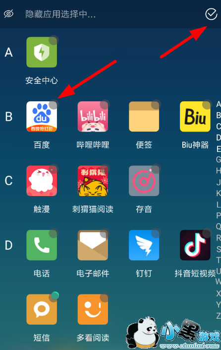 3、通过右上角的“+”按钮唤起隐藏应用的列表,然后勾选需要隐藏的应用,点击右上角对勾就可以成功隐藏应用了!
