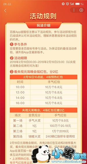 第四场:锦鲤大奖240辆红旗轿车 使用权2月19日元宵晚会期间,共有2场红包互动和2场惊喜大奖,看央视元宵晚会跟主持人一起,打开最新版本百度App在首页摇-摇,和亲朋好友一起瓜分2亿红包! (具体互动开始时间以央视元宵晚会主持人互动时间为准), 上述预热红包、晚会4场红包,除有普通红包外,更有手气红包幸运奖。