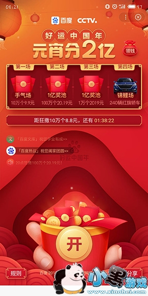 央视元宵晚会:4场红包狂撒2亿场次手气红包第一场:手气大奖10万个9.9元、第二场1亿100万个20.19元、第三场1亿1万个2019元;第四场锦鲤大奖240辆红旗轿车,使用权2月19日元宵晚会期间,共有2场红包互动和2场惊喜大奖,看央视元宵晚会跟主持人一起,打开最新版本百度App在首页摇-摇,和亲朋好友一起瓜分2亿红包!