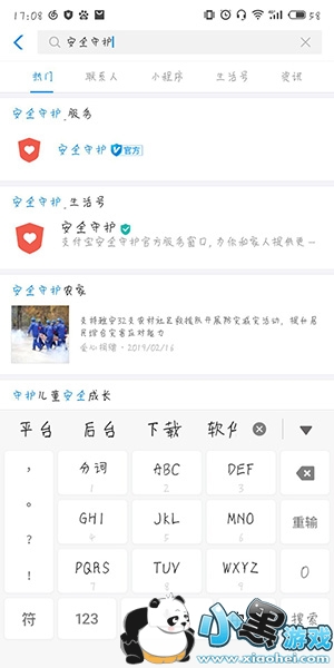 1、打开支付宝,在搜索栏里搜索安全守护。