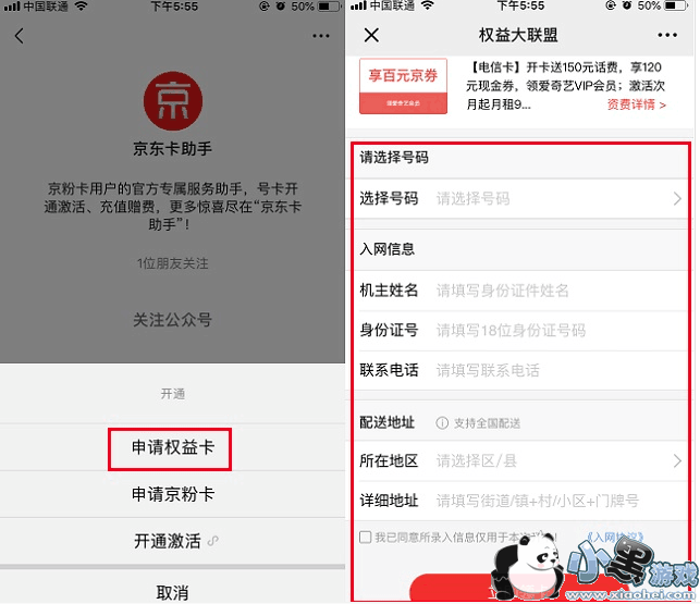 2、点击“申请权益卡”,填写相关信息,然后点击立即领卡。京东权益卡是免费领取的,初审通过后,坐等快递送SIM手机卡。