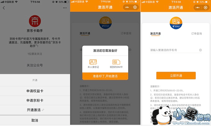 3、收到手机SIM卡之后,接下来的操作就是激活了。同样是在微信中打开“京东卡助手”公众号,然后点击“开通”,再点击下方的“开通激活”,然后准备好本人身份证和收到的SIM卡,进行激活。先是输入申请的手机号,然后点击“立即开通”,之后根据提示,手持身份证,录制一个视频,主要用于实名认证,完成之后即可开通使用了。