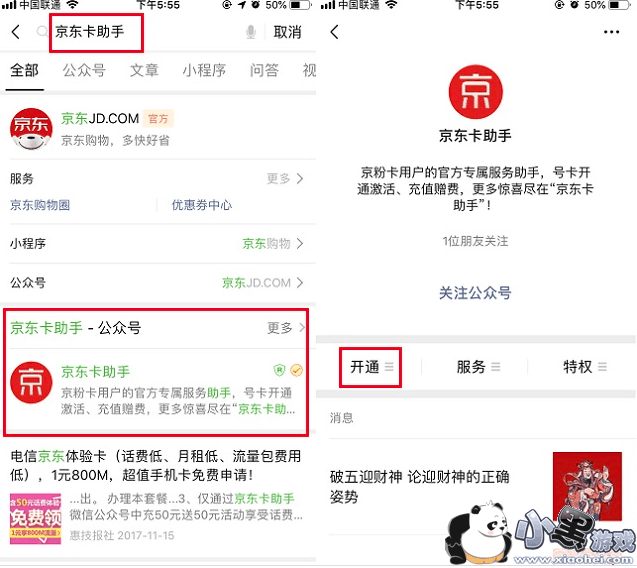 1、开通京东权益联盟卡,我们需要借助微信,在微信中搜索“京东卡助手”,进入微信公众号,然后点击“开通”。