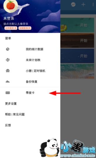 1、虽然很多朋友都想设置白名单,但是在番茄todo里需要大家购买了季度卡才能设置白名单,我们需要先点击左上角的按钮进入个人功能列表,选择“季度卡”功能。