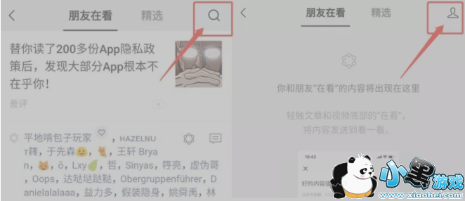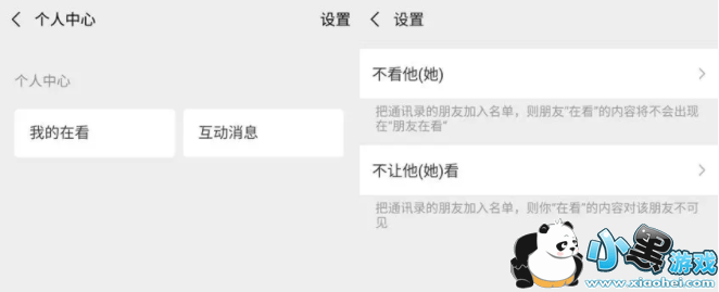 接下来是在看一看中的搜索变成了个人设置中心的图标,里面的功能其实也很简单,有“我的在看”、“互动消息”、“设置”三个功能,那么在设置当中可以设置不看他以及不让他看。