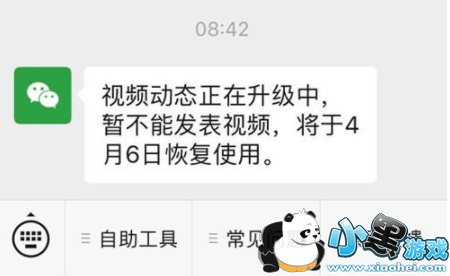 4月4日,微信派发布公布,从4月4日零时起,微信表情商店、视频动态功能将启动后台服务升级,暂停使用,预计4月6日恢复。其他功能不受影响。当你在使用动态视频的时候也会有微信的提示:视频动态正在升级中,咱不能发表视频。