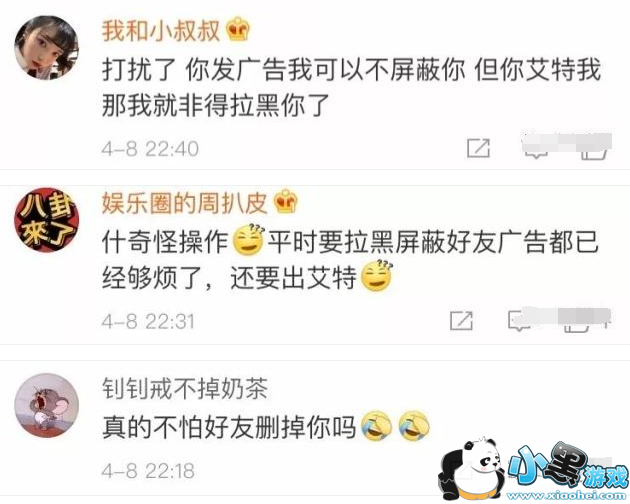 这样的新功能出来之后也引来了网友的热议,有网友说又要“少”朋友了,同时也有人调侃这样可以是广告更加的精准了,因为可以直接艾特某人。也有网友说,自己已经把广告给屏蔽了,如果朋友还是艾特自己会不会收到红色的惊叹号呢?
