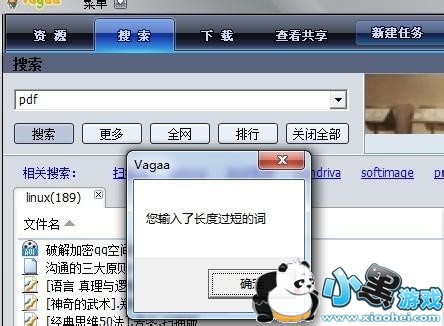 1、搜索提示”关键字太短“这类怎么解决?比如你要搜索PDF文档类的,你搜索PDF,会提示关键字太短不能搜素。那么你可以输入 PDF pdf输入2次,注意中间是空格。这样的话,他其实就能搜到了