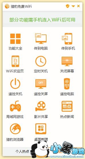 猎豹免费wifi校园神器是一款永久免费的无线路由器,是猎豹公司推出的一款专门针对校园网的网络共享软件。软件支持大部分的校园网络,能突破校园网共享限制,只要你的带无线网卡的电脑安装了猎豹免费wifi,那么你的手机、pad等都可以通过你的电脑连接网络,让你在校也有属于自己的网络。