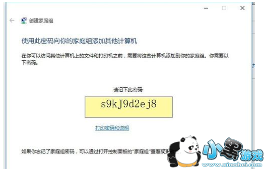 待创建“家庭组”完成后,将弹出如图所示的“家庭组密码 ”界面,记下此家庭组密码,用于将其它计算机通过“家庭组密码”添加到本家庭组中,以实现文件共享访问功能。