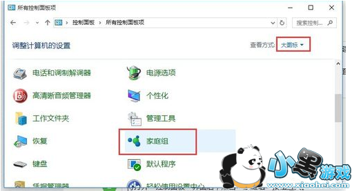 待打开“控制面板”界面后,将“查看方式”设置为“大图标”,并从此界面中找到“家庭组”项点击进入。