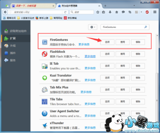 3、安装完毕后在扩展里找到FireGestures插件,然后点击“选项”按钮;