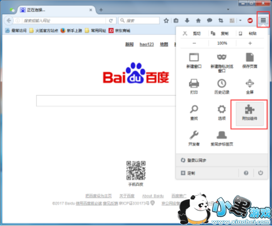 1、首先我们在火狐浏览器右上角的菜单中打开“附加组件”;