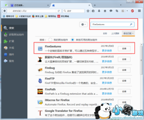 2、接着在“扩展”的搜索框中搜索“FireGestures”,搜索完毕后下载安装该插件(安装完毕后记得重启浏览器),如下图所示: