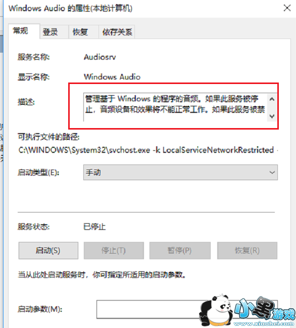 进去“Windows Audio”服务属性界面之后,可以看到这是音频设备和效果的服务,如下图所示: