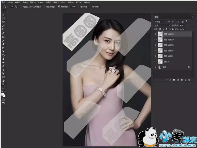11、这时,你会发现有水印的地方会有部分小锯齿出现,我们现在用修补工具、印章工具对细节进行优化,直至最终完全去掉水印,如图: