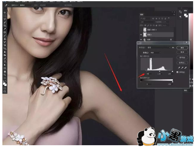 10、打开背景图,同时选择“图层1”,键入快捷键Ctrl+L,打开色阶,然后把黑色色块往右边滑动,水印会慢慢消失,直至水印完全消失就可以不滑动,如图: