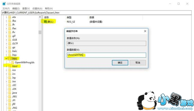 在弹出的对话框中的黄色区域内填入数据,这个数据格式为“浏览器名称+HTML”。我的电脑上使用的是Chromes浏览器,所以我填的是ChromeHTML,大家可以根据自己的电脑浏览器填入合适的数据,然后点击确定即可。