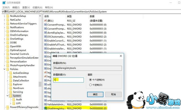 定位到如上注册表项后,我们在右边查找“Disableregistrytools”这个注册表项,然后将其数值数据改称“1”即可。