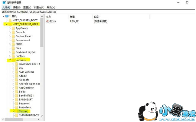 然后点击确定,进入注册表界面,我们在注册表左边的注册表分支里找到HKEY_CURRENT_USERSoftwareClasses,如下图所示: