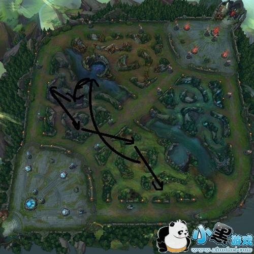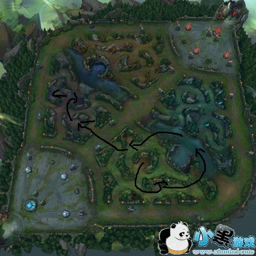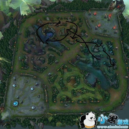 这个刷野效率比第一个要低,不过容易抓中上路,在刷完河蟹之后可以往上中看一下有没有机会抓人,没找到机会可以直接开蓝刷野。