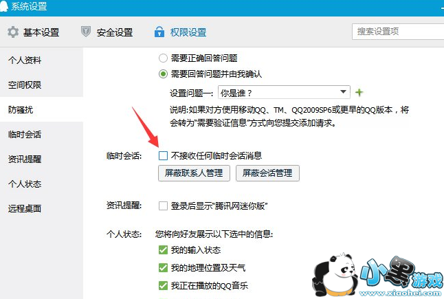 1、首先,被禁止加好友后会被锁定24消失,这期间是没办法有哪些加好友的,如果确实需要和人聊天,可以使用临时会话,如果无法使用,在QQ的权限设置中将“不接收临时会话”前的勾去掉即可。
