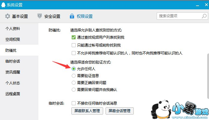 2、另外,在权限设置的“防骚扰”下勾选验证方式为“允许任何人”,可以让对方加你好友,使用这种验证方式需要用户被添加好友功能只针对单方面限制的情况,如果对方添加用户QQ的时候提示该用户被检测到安全隐患,则还是得等这次的锁定解除了才可以添加。