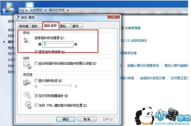 在鼠标属性的指针选项下就可以调节鼠标指针移动速度,