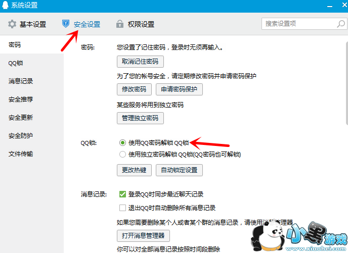 4、进入系统设置页面,我们选择“安全设置”,在“安全设置”下方的设置项中,我们能够看到“使用QQ密码解锁QQ锁”,点击选择该设置项;