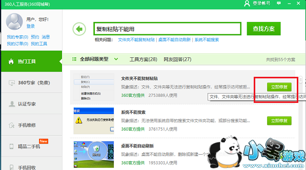 进入360人工服务页面,在搜索框中输入“复制粘贴不能用”,点击查找方案,如下图所示: