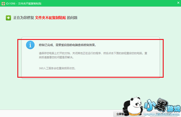 等待一下,问题就修复完成了,重启电脑,看看是否能复制粘贴文件、文件夹,如下图所示: