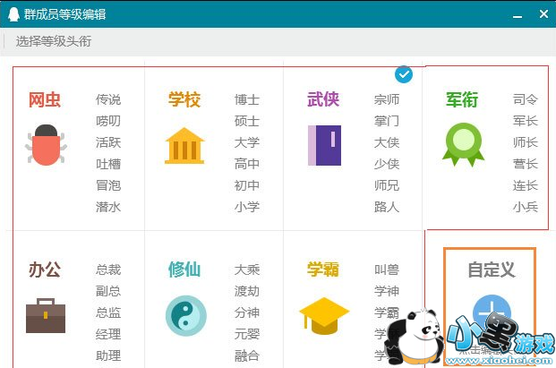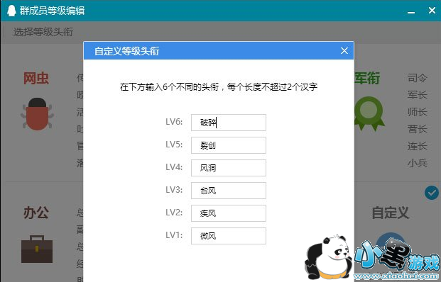 3、我们看到默认是lv1~lv6的等级,我们可以选定一个官方提供的头衔,也可以自定义编辑,点击自定义就可以编辑了。
