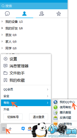 1、打开QQ,点击左下角的“主菜单”——“帮助”——“我的QQ中心”,如图所示。