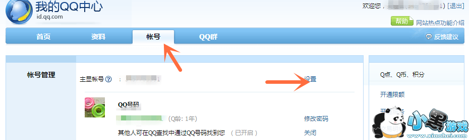 2、此时会进入我的QQ中心页面,点击“账号”选项,来到账号管理模块,点击主显账号右侧的“设置”。