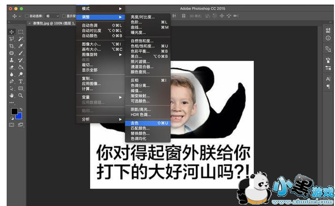5、接下来将选区拖动至表情包背景图,在上方工具栏选择【图像】-【调整】-【去色】。