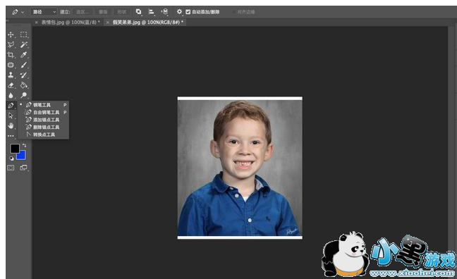 3、完成背景处理后,导入想要制作成表情包的照片,在左侧工具栏选择【钢笔工具】,将头部框起来。