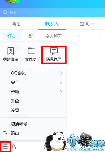 在电脑上登录QQ,点击面板左下角的图标,在弹出的菜单中选择“消息管理”选项,