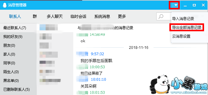 进入消息管理器界面,点击右上角的三角形图标,弹出菜单、点击“导出全部消息记录”选项,