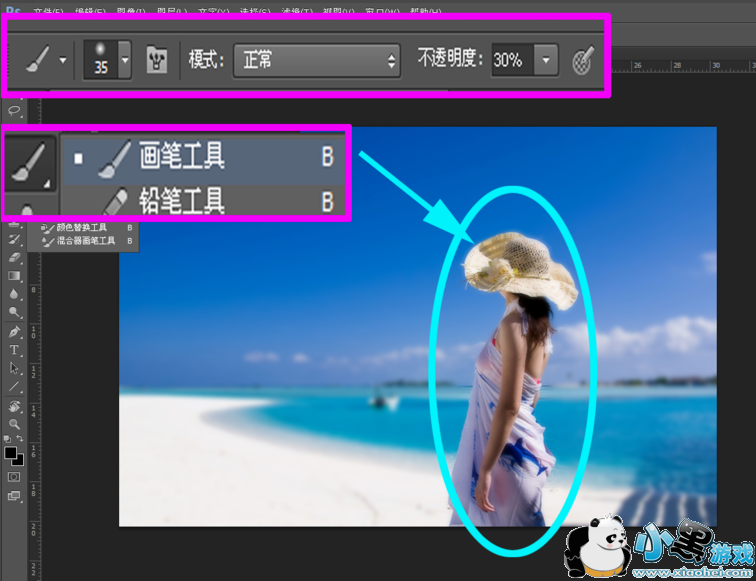 6、在工具栏中点击画笔工具,将不透明度设置为30%,对照片中的人物进行涂抹编辑,从而得到较好的景深效果,