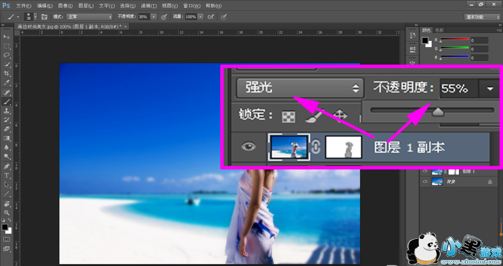 8、然后再将图层1副本的图层混合模式设置为强光,将不透明度设置为 55%,增强效果,