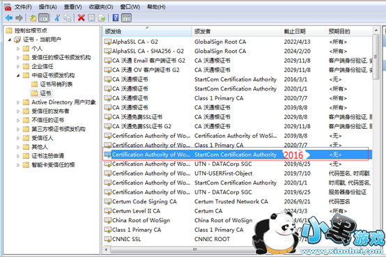 第二步:找到“中级证书颁发机构”找到如下图的证书(注意截至日期是2016年3月1日颁发给是“Certificatetion Authority of WoSign”颁发者是“StartCom Certification Authority” )