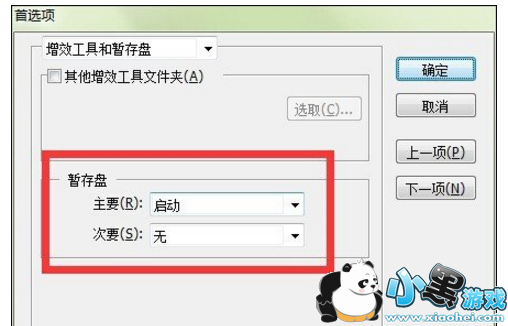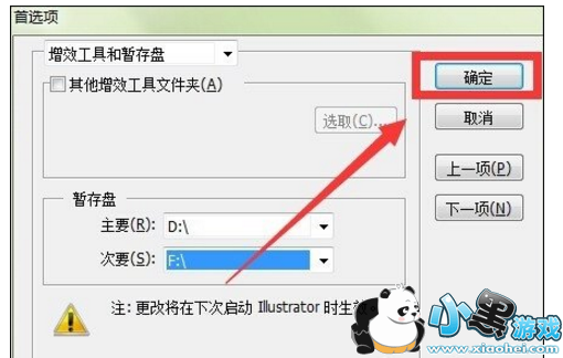 2、在“首选项”设置面板,将“暂存盘”选项,将盘D和F打开,等到出现”注:更改将在下次启动AI时生效“,即完成设置。