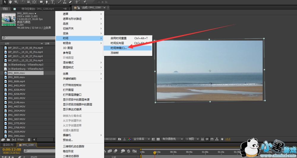 选中后点击鼠标右键,选择时间——时间伸缩,